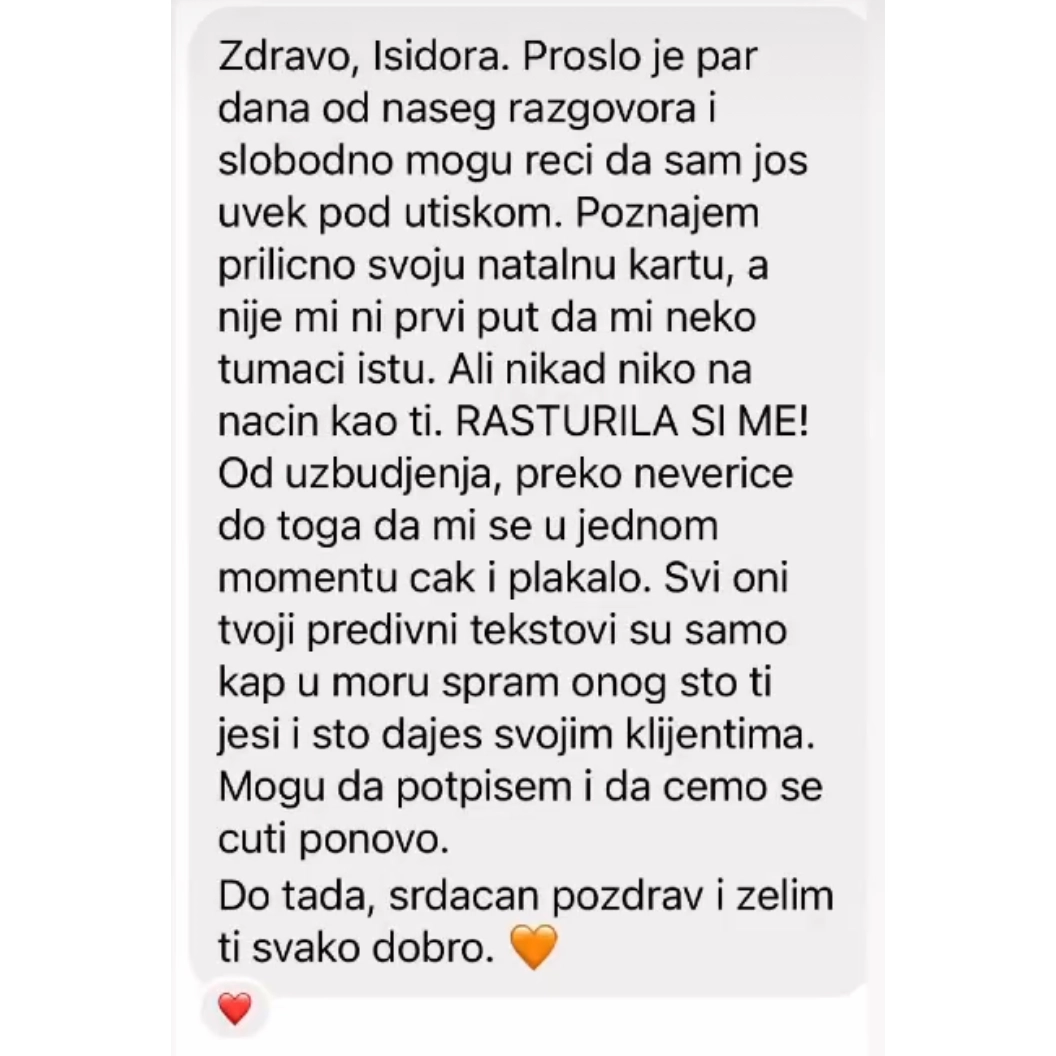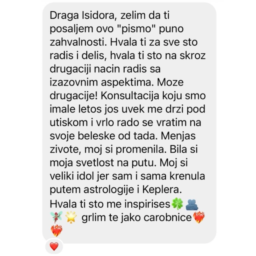 Stvorila sam mesto u kom se osete ljubav i iskrena podrška, u kom prenosim poruke neba jezikom astrologa, u kom palim sve svetla tamo gde su mrak i tama, u kom te vodim u centar tvog srca u kom zive sva tvoja maštanja, svi tvoji strahovi, sve tvoje lekcije, svi tvoji putevi.